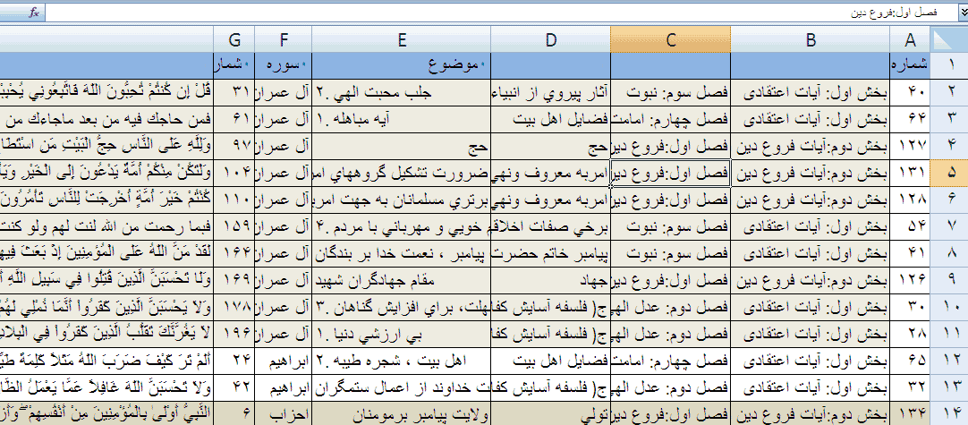 اصطلاح سورت کنم.به عنوان نمونه قسمتی از اطلاعات آیات مربوط به دو سوره اول در 150موضوع